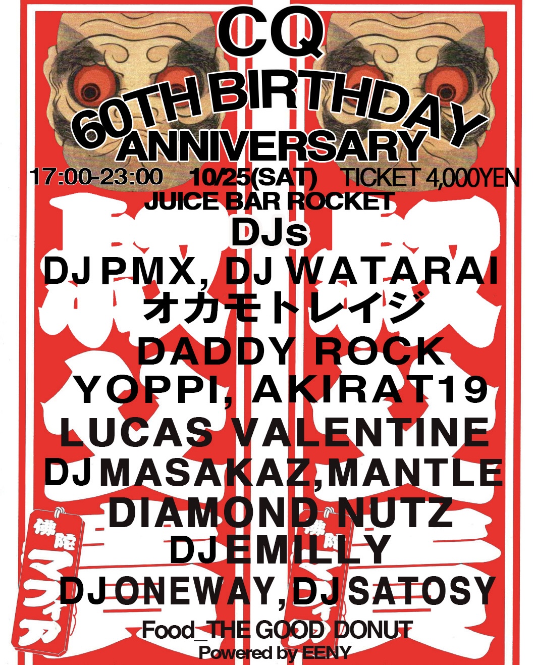 【DJ PMX出演情報】10月25日 CQ 60TH BIRTHDAY ANNIVERSARY at JUICE BAR ROCKET 北千住